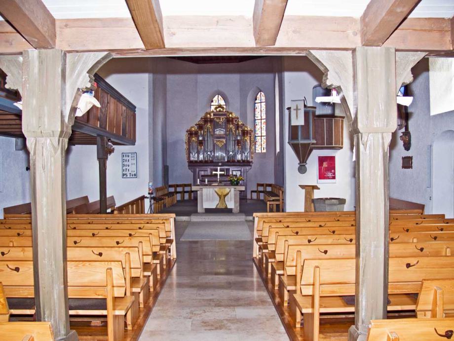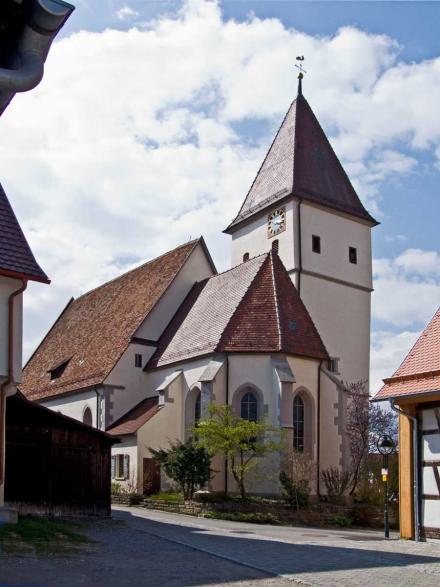 " Beinahe in der Mitte des Orts steht die 1469 in einfachem germanischen Styl erbaute Pfarrkirche, welche übrigens in den Jahren 1699 und 1817 stylwidrige Veränderungen erlitten hat. Der viereckige Thurm, von dessen drei Stockwerken die zwei untersten massiv erbaut sind, ist nicht hoch und ragt nur mit seinem einfachen Zeltdach über den First der Kirche empor; auf demselben hängen drei Glocken, von denen eine, im Jahre 1512 gegossene, sehr groß ist, die mittlere ist von 1629, und die kleinste, sehr alte, trägt die vier Evangelistennamen in verkehrter ganz roh ausgeführter Schrift. Das Innere der Kirche hat außer einem alten Taufstein und einem gut aus Holz geschnittenen, in neuerer Zeit kunstlos angestrichenen, lebensgroßen | Bild des Gekreuzigten nichts Bemerkenswerthes. Das untere Stockwerk des Thurms hat ein Kreuzgewölbe mit dem Christuskopf auf dem Schlußsteine, und trägt noch einzelne Spuren romanischer Bauweise, welche bekunden, daß der Thurm weit älter ist, als das gegenwärtige Langhaus. Die Baulast der Kirche hat zu 2/3 die örtliche Stiftungspflege und zu 1/3 der Heilige in Nebringen zu bestreiten. Der ummauerte, ziemlich große Begräbnißplatz liegt außerhalb (östlich) des Orts."