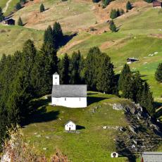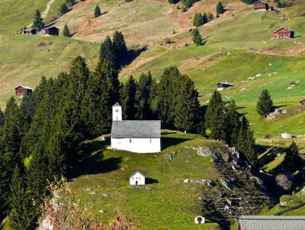 Die Wallfahrtskirche Kapelle St. Eusebius (rät. Sogn Sievi) mit dem romanischen Turm steht auf dem gleichnamigen keltisch/römischen Burghügel nördlich von Brigels.