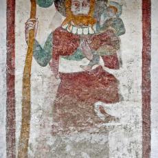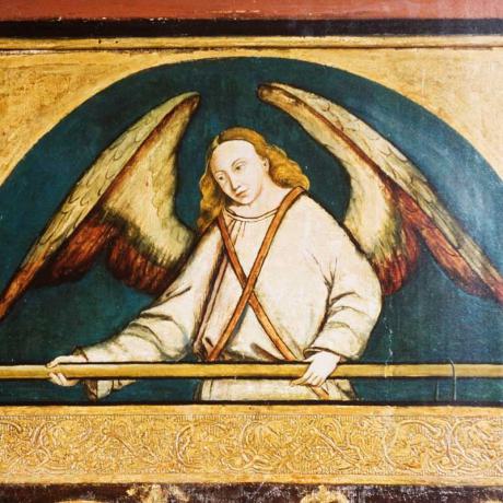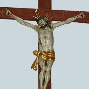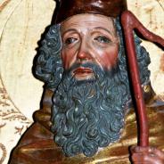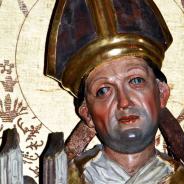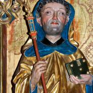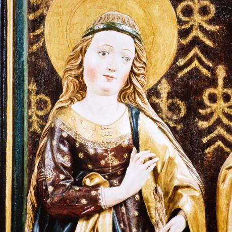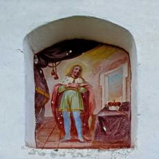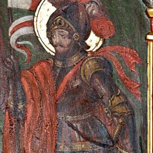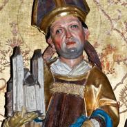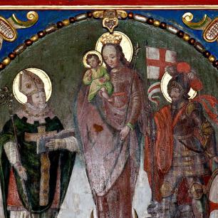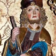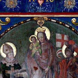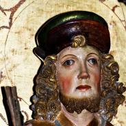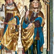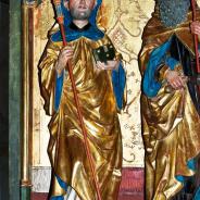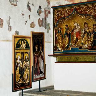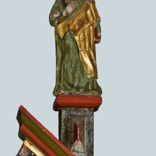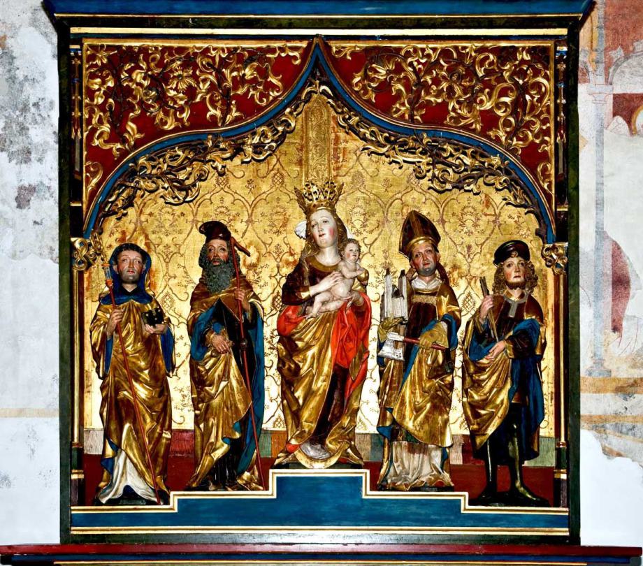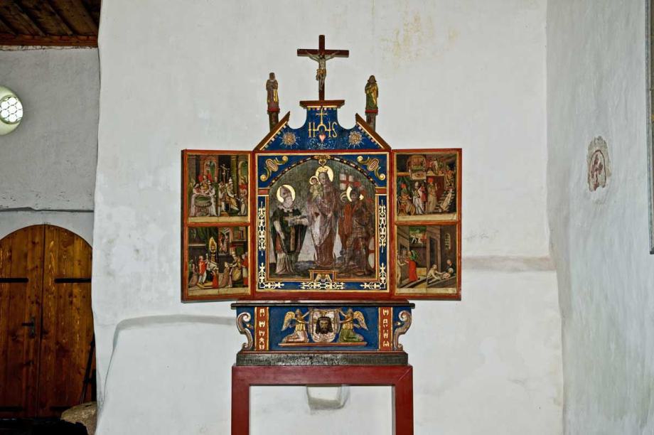 Bemalter Flügelaltar von 1633. Er wurde bei der Renovierung des Hochaltars wieder zusammengesetzt und an der Südwand (*) aufgehängt. Das Mittelstück zeigt die Muttergottes zwischen St. Eusebius und Georg, auf den Innenseiten der Flügel ist die Legende des Titelheiligen dargestellt. (siehe Diashow mit Einzelerläuterungen darunter)