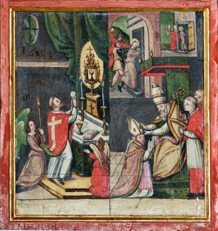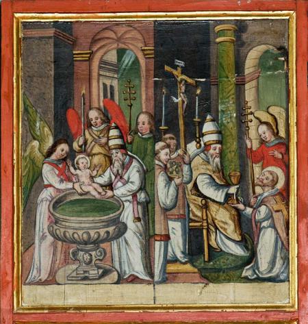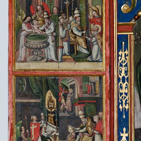 Eusebius (als Kind) wird bei der vom Papst vorgenommenen Taufe von einem Engel getragen; daneben: die Engel dienen dem Heiligen bei seiner Priesterweihe.