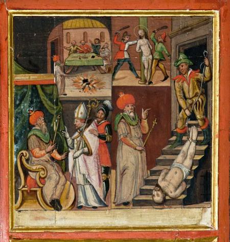 die Einkerkung in Scythopolis, Steinigung unter dem arianischen Kaiser Valens und Bestattung in Vercelli. Ikonographisch ist dieser Zyklus bemerkenswert als ziemlich getreue Illustrierung der Erzählung in der "Legenda aurea".