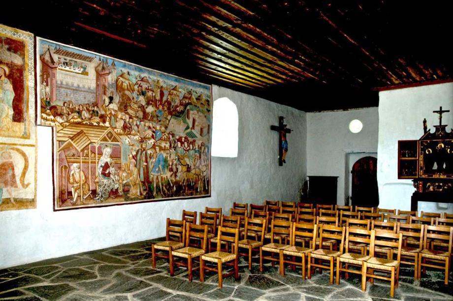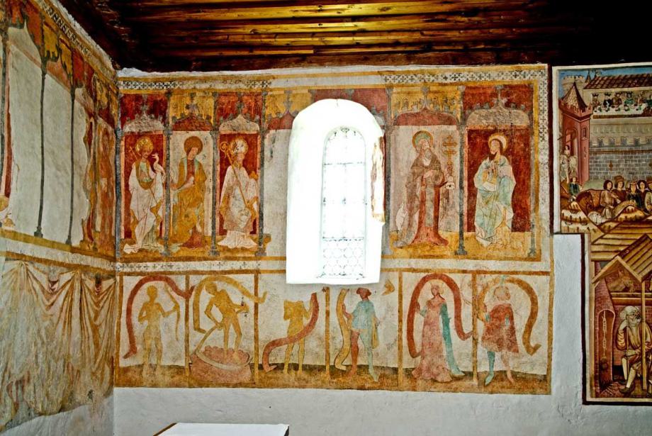 Die Kapelle St. Jakob (rät. Sogn Giacun): Kapelle und Holzdecke wurden 1514 erbaut. Die Aussenmalereien aus dem Jahre 1515 stammen von den oberitalienischen Brüdern Soregno.