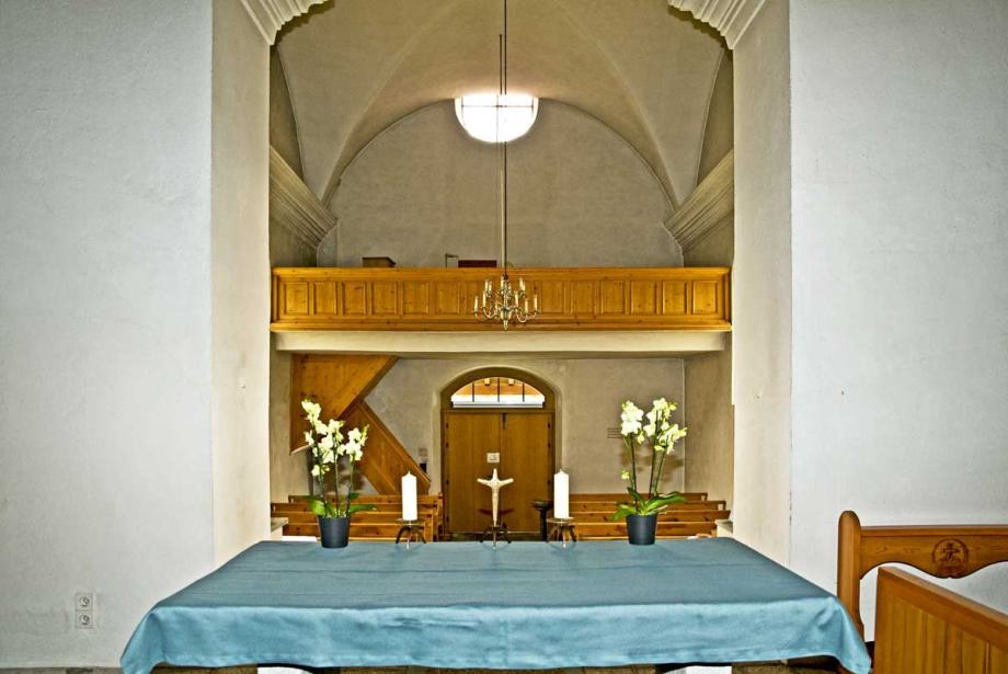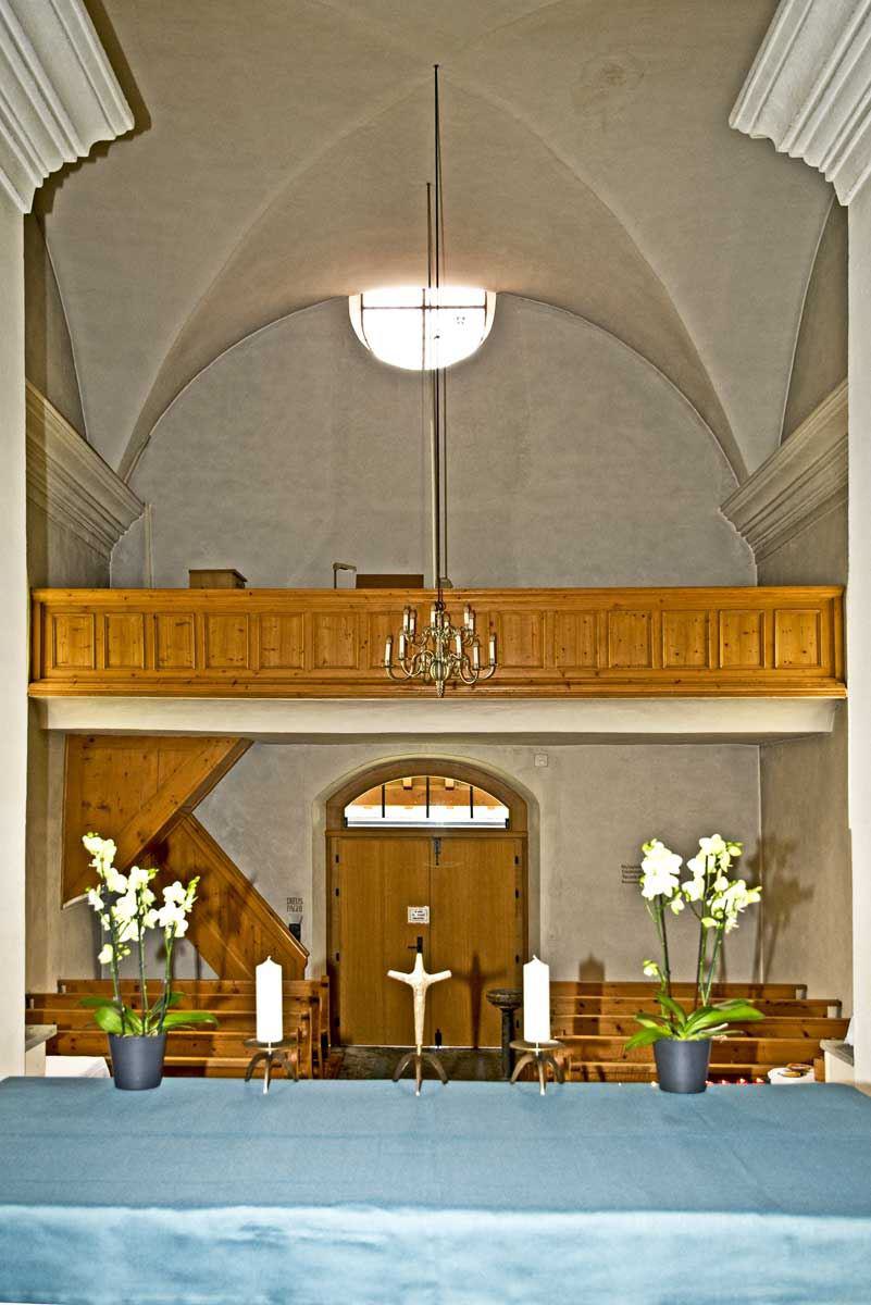 In Türnähe liest man die Inschrift: "BAGHEDIADA ILS ONNS 1899 - 1901, CONSECRADA ILS 18.8.1901, TUCCADA DIL CAMETG ILS 23.7.1986, RECONSECRADA ILS 6.9.1987" Vor dem Portal, das von einem kleinen Pultdach geschützt ist, wird die alte Glocke von 1612 aufbewahrt. Der Dachreiter erhebt sich auf dem Satteldach der Kapelle über dem Eingang. Er ist mit Kupferblech beschlagen, besitzt rundbogige Schallfenster mit Jalousien und ist mit einer hochgezogenen Haube mit Kugel und Kreuz bekrönt. In ihm erklingen die elektrisch angetriebenen drei Glocken.