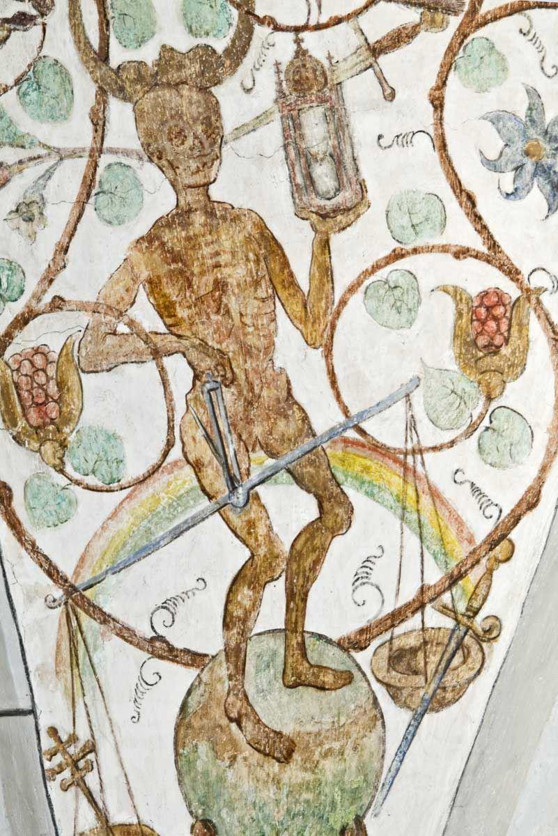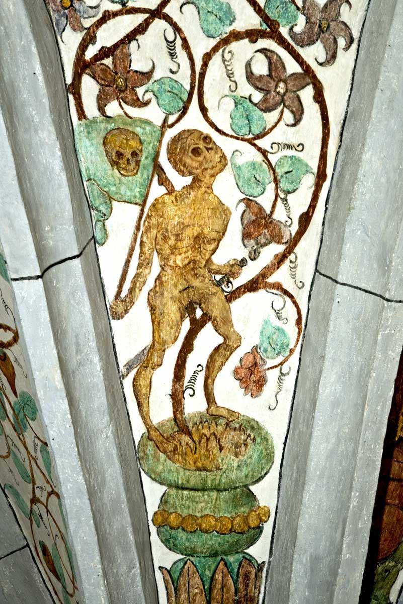 Bemerkenswert sind besonders die in das Gezweig hineinkomponierten Todesdarstellungen in den Zwickeln der Evangelienseite, die hier zwar im Osten liegt, aber bei normaler Achsenstellung Nordseite, also in symbolischem Sinn die Seite der Nacht und des Todes wäre. Die betreffenden Bilder sind überdies an den gegen Norden sehenden Kappenfeldern angebracht. Der Tod ist nicht völlig als kahles Gerippe dargestellt wie bei Holbein, vielmehr ist nach spätgotischer Gepflogenheit nur der Schädel entfleischt, der Körper aber mit Haut bekleidet.