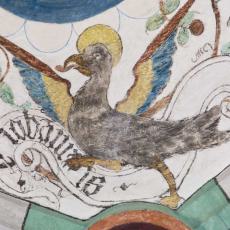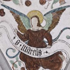 Der mittlere Rautenschild ist mit den Symbolen der vier Evangelisten gefüllt: Engel (Matthäus), Löwe (Markus), Stier (Lukas), Adler (Johannes). Sie verkünden die Gegenwart Gottes und sein Wirken in der Kraft des Heiligen Geistes, der als Tröster bei den Gläubigen ist. Dies hat man in alter Zeit dadurch anschaulich gemacht, dass man zu Pfingsten eine hölzerne Taube aus dem Gewölbe herabschweben ließ. Das dazu nötige Heilig-Geist-Loch' befindet sich im mittleren Rautenschild, umgeben von den Evangelisten, exakt in der Mitte der Kirche.