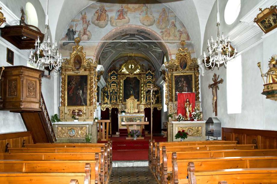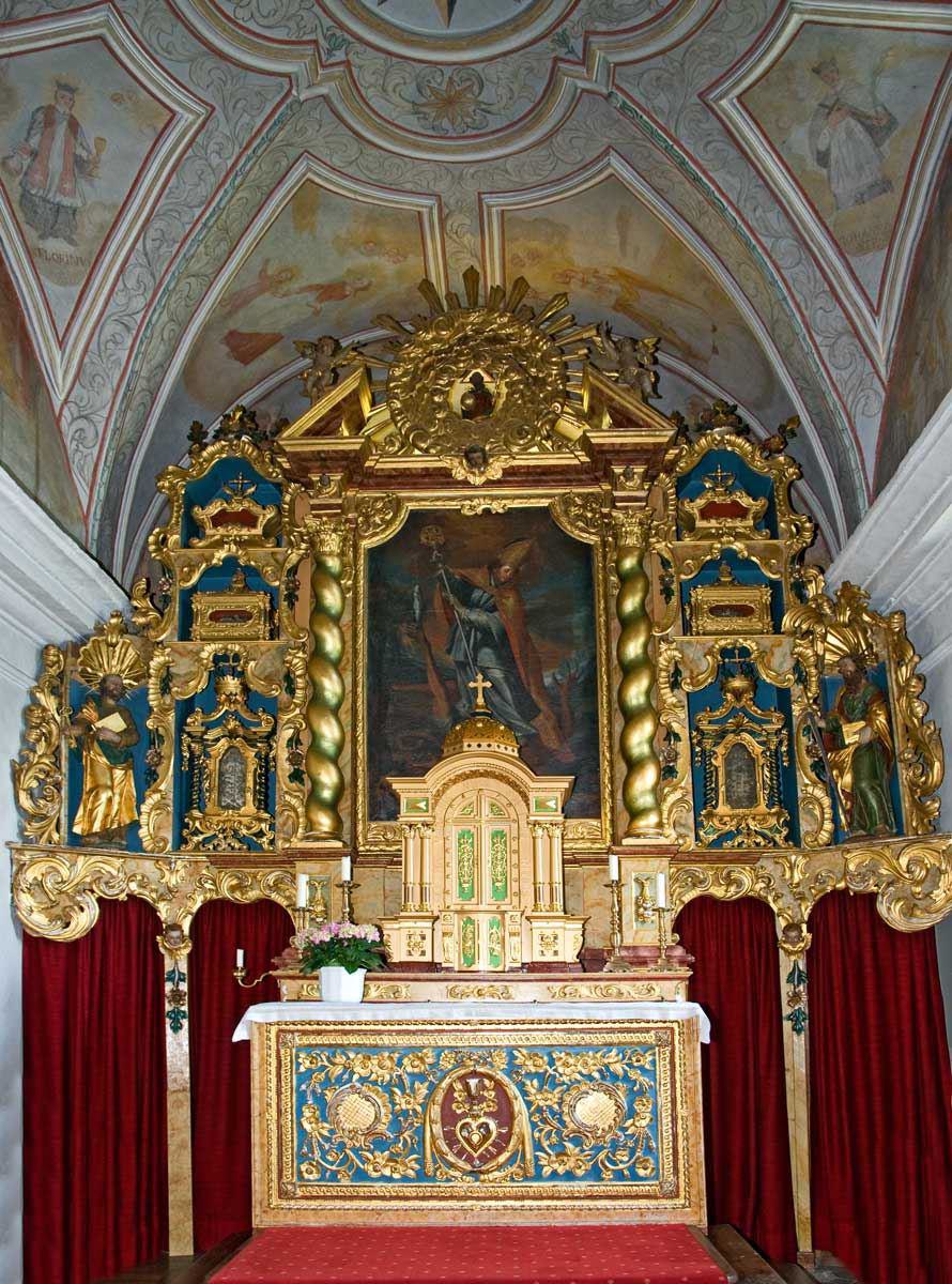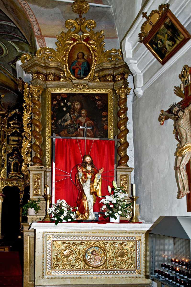 Der Hochaltar im Chor ist barocker Herkunft und dürfte um 1700 entstanden sein. Der Mittelteil mit dem lebensvollen Bildnis des Patrons wird durch zwei goldschimmernde gewundene Säulen eingerahmt. Früher sah der Hochaltar anders aus. Die beiden Flügel des spätgotischen Altars sind abgewandert und zwar nach Zürich. In einem Saal des schweizerischen Landesmuseums kann man die wohl bald halbjahrtausendalten Altarflügel bewundern. Sie stellen Johannes den Täufer und den Heiligen Luzius sowie Maria Magdalena und die Heilige Barbara mit ihren Symbolen dar.