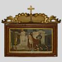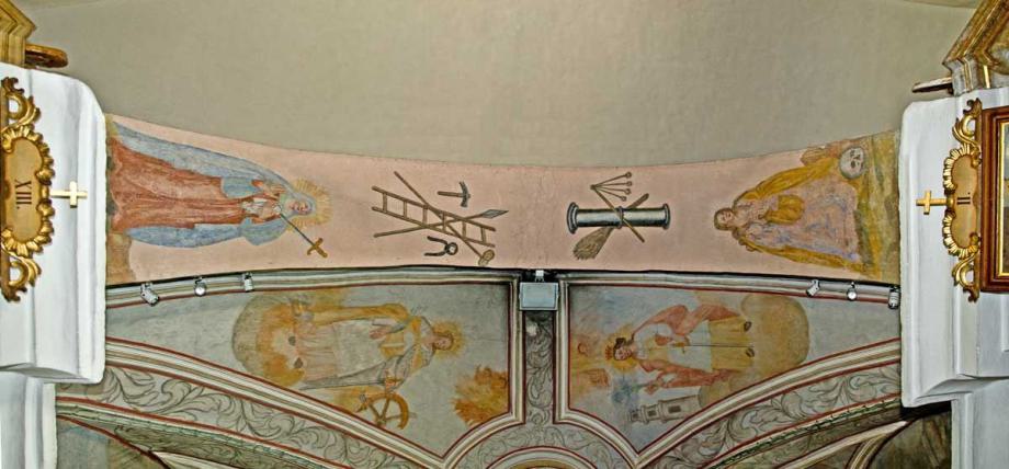 Die 14 Kreuzwegstationen beginnen im Chor auf der Südwand (rechts) und laufen dann im Uhrzeigersinn nach hinten im Schiff und auf der Nordwand Schiff zurück vor zum Chor. Die Tafel sind hoch oben auf dem profilierten Gesims angebracht (siehe Bilder Schiff / Chor gesamt).