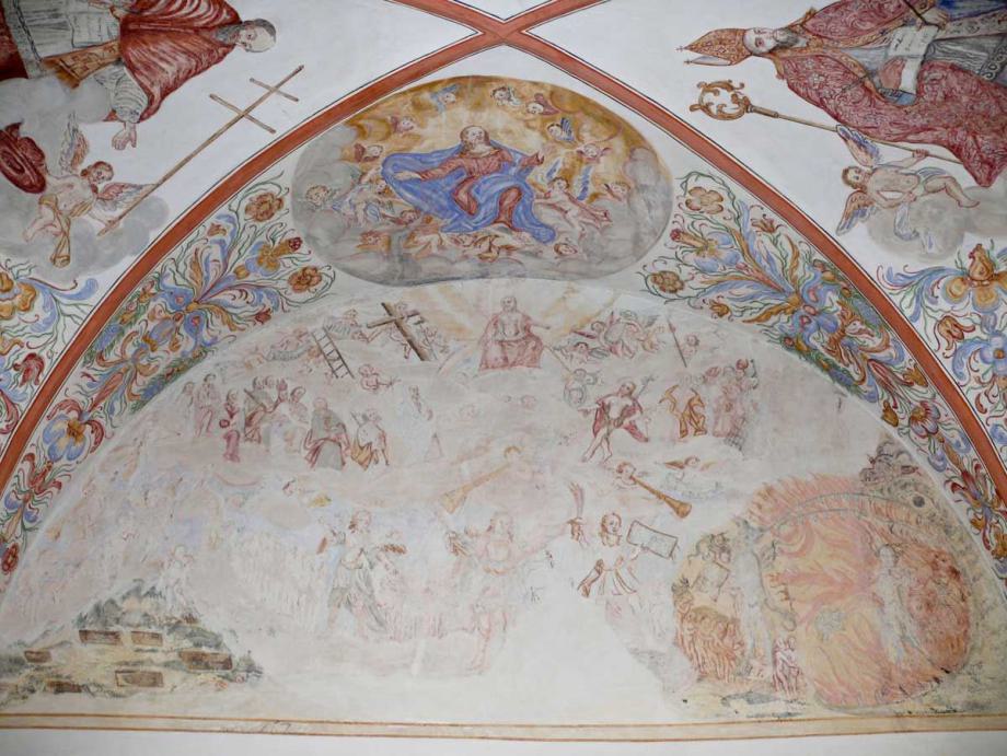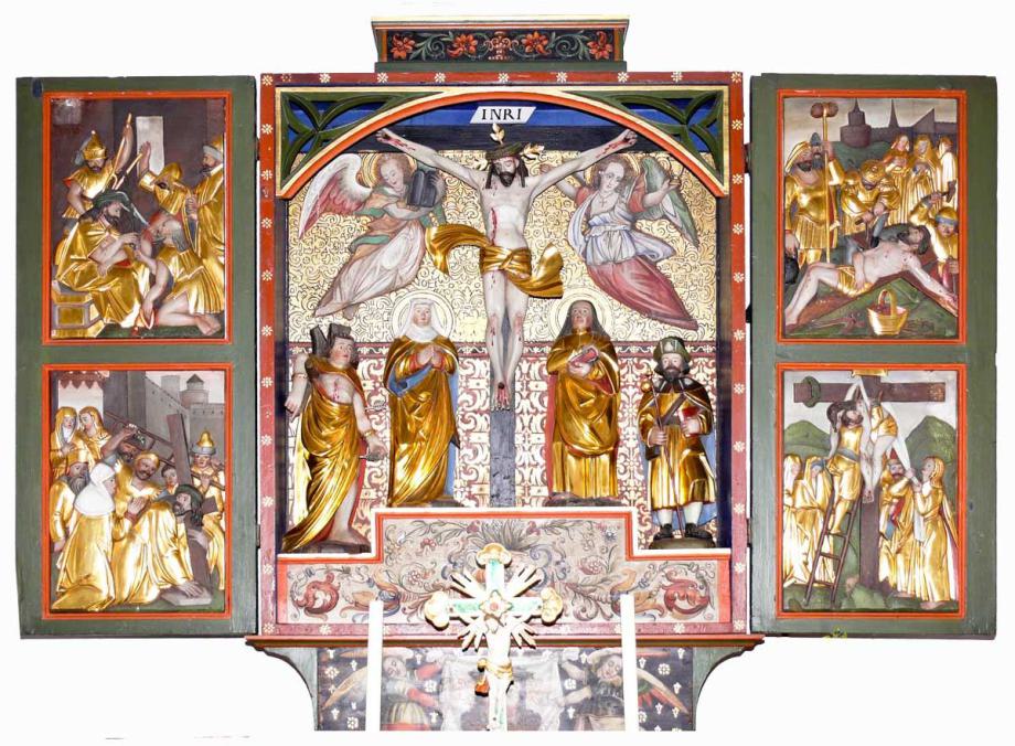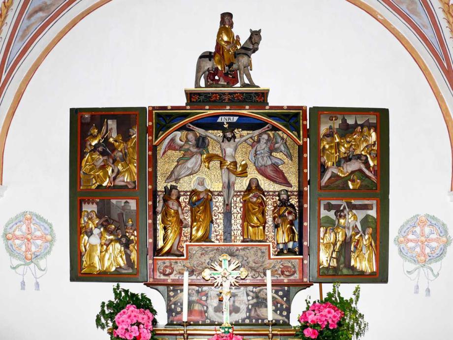 "Neubau 1610, mit Rechteckchor; Renov. 1926 27, Rest. 1990 92. Vollständig ausgemalt um 1730 von Johann Jakob Rieg mit Evangelisten, Kirchenvätern, Heiligen, Marienszenen und dekorativer Rankenmalerei. An Rückwand Jüngstes Gericht 167(?). Bemerkenswerter nachgot. Choraltar 1605 von Hans Jakob Greutter, neu vergoldet 1926: Im Schrein vollplastische Kreuzigungsgruppe, auf den Flügeln vier Passionsreliefs und an den bemalten Aussenseiten die vier Kirchenväter; auf dem Schrein spätgot. Reiterfigur des hl. Martin 1520 25. In nachträglich angebauter Vorhalle Kruzifix 18. Jh."