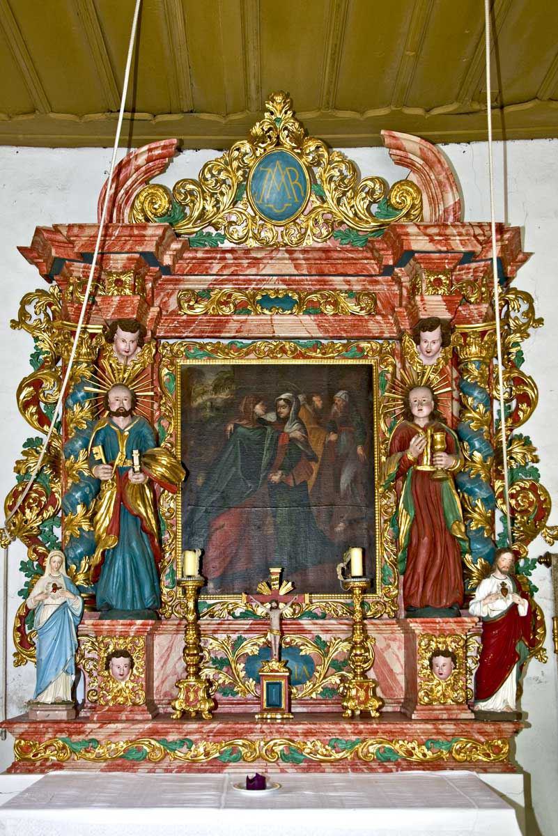 Der ländliche, barocke Altaraufsatz, um 1700, besteht aus zwei gewundenen Freisäulen und zwei Pilastern, vor denen die Figuren des hl. Petrus und des hl. Johannes Evangelist stehen. Das darüber gelegte Gebälk stösst schräg über die Säulen hinaus. Seitlich wird der Altar mit Akanthusranken abgeschlossen. Die Pietà auf dem neuen Sockel an der Seitenwand wird dem Schnitzer des Altars zugeschrieben.