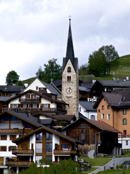 "Die Pfarrkirche gehört zu den frühesten Kirchen am Vorderrhein, da sie schon 831 als königliche Eigenkirche urkundlich erwähnt wird. Von diesem frühmittelalterlichen Bau ist nichts mehr erhalten. Der Turm stammt jedoch noch aus romanischer Zeit (um 1200). Er ist heute noch gut erhalten. Der Dorfbrand von 1740 zerstörte die Kirche bis auf das Chorgewölbe und den Turm. 1904 wurde die Kirche, bis auf den Turm, abgebrochen und geostet neu gebaut. Die Innenausstattung wurde im Jugendstil gehalten und die alten Barockaltäre 1907 nach Schindellegi verkauft.