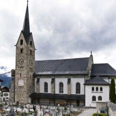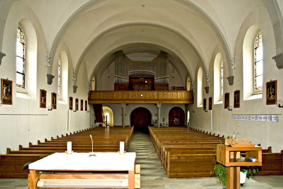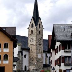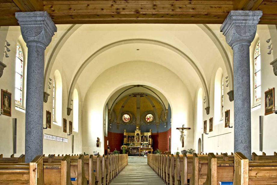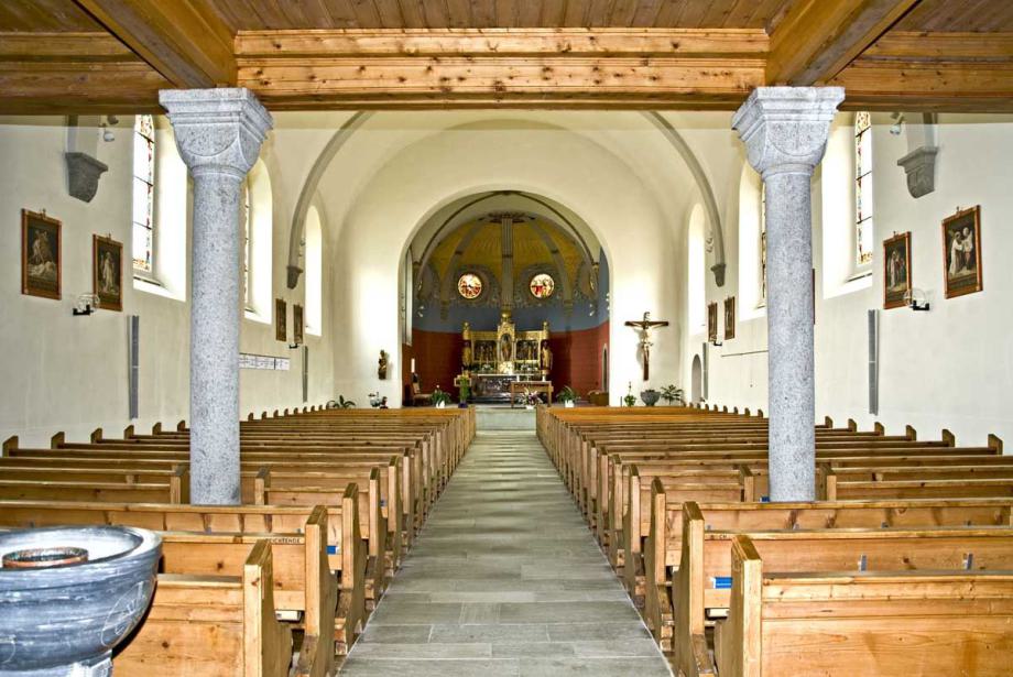 "Die Pfarrkirche gehört zu den frühesten Kirchen am Vorderrhein, da sie schon 831 als königliche Eigenkirche urkundlich erwähnt wird. Von diesem frühmittelalterlichen Bau ist nichts mehr erhalten. Der Turm stammt jedoch noch aus romanischer Zeit (um 1200). Er ist heute noch gut erhalten. Der Dorfbrand von 1740 zerstörte die Kirche bis auf das Chorgewölbe und den Turm. 1904 wurde die Kirche, bis auf den Turm, abgebrochen und geostet neu gebaut. Die Innenausstattung wurde im Jugendstil gehalten und die alten Barockaltäre 1907 nach Schindellegi verkauft.