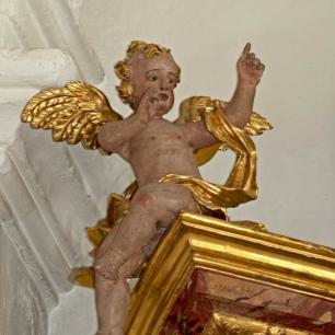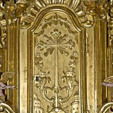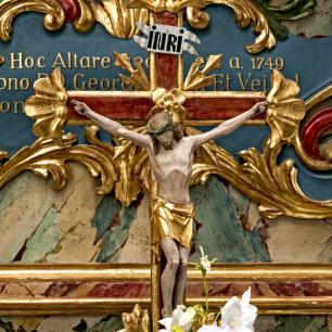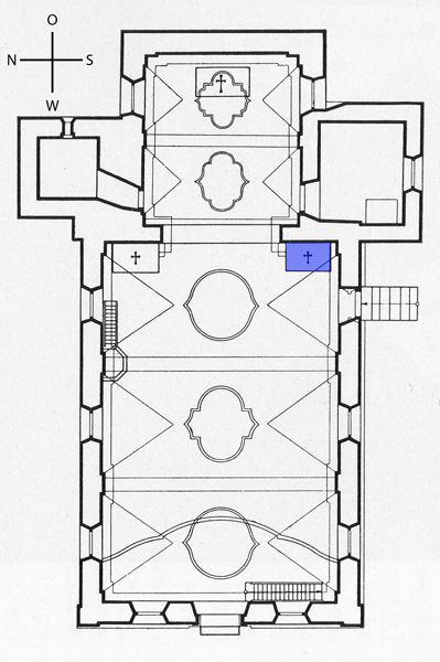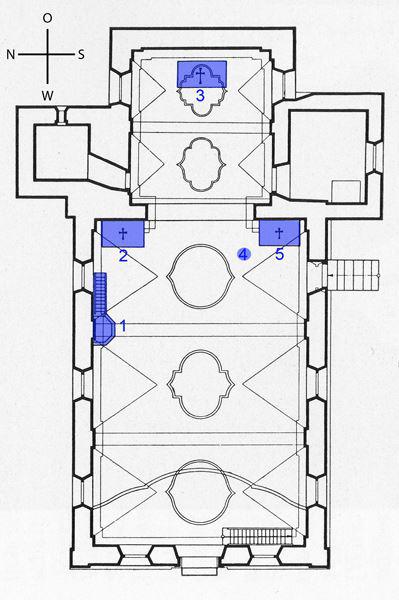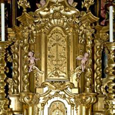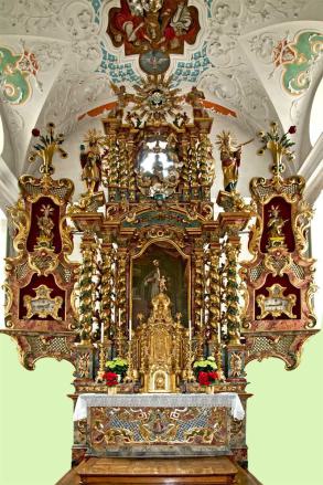 Der Hochaltar der ersten Kirche fand im Neubau des 18. Jahrhunderts keinen Platz. Der neue Hochaltar ist hier oben ausführlich dargestellt und dokumentiert.