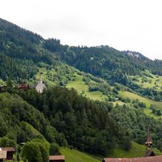 Von Trun führt ein Kreuzweg zur Wallfahrtskirche Maria Licht. Nachfolgend Blick von der 1. Station ins Tal zur Pfarrkirche St. Martin, im Vordergrund das heutige Museum Sursilvan "Cuort Ligia Grischa". Danach Diashow Kreuzweg und Vollbild 14. Station