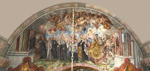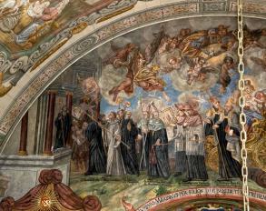 Der Zug wird geleitet von St. Benedikt, gefolgt von den Mönchen Beda, Bernhard, Maurus, Adalgott. Dann paarweise Erzbischöfe, Kardinäle, Päpste den Triumphwagen Mariens ziehend.