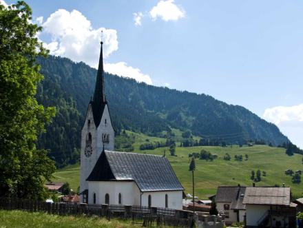 "Ersturkundlich bezeugt ist die Kirche als spätgotischer Bau mit markantem Spitzhelm auf dem Turm 1481 als Nachfolger eines nicht mehr datierbaren, doch wesentlich älteren romanischen Vorgängers. Die barocke Orgel mit prächtigem Ornament auf dem zweiflügeligen Prospekt ist eine Schenkung des Valendaser Bürgers Johann Peter Marchion (1669-1742).