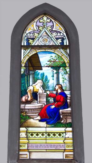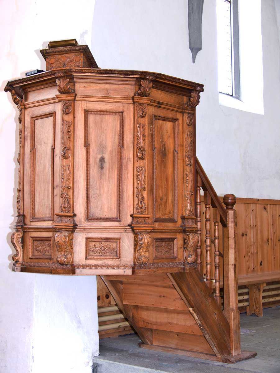 Auffallend im Inneren ist der runde, dreiseitig geschlossene Chor mit Taufstein in der Mitte. Die Kanzel vermittelt zwischen Chor und Schiff. Die Glasmalereien in den Chorfenstern sind neueren Datums und ersetzten die alten aus dem 16. Jahrhundert, die 1912 verkauft worden waren.