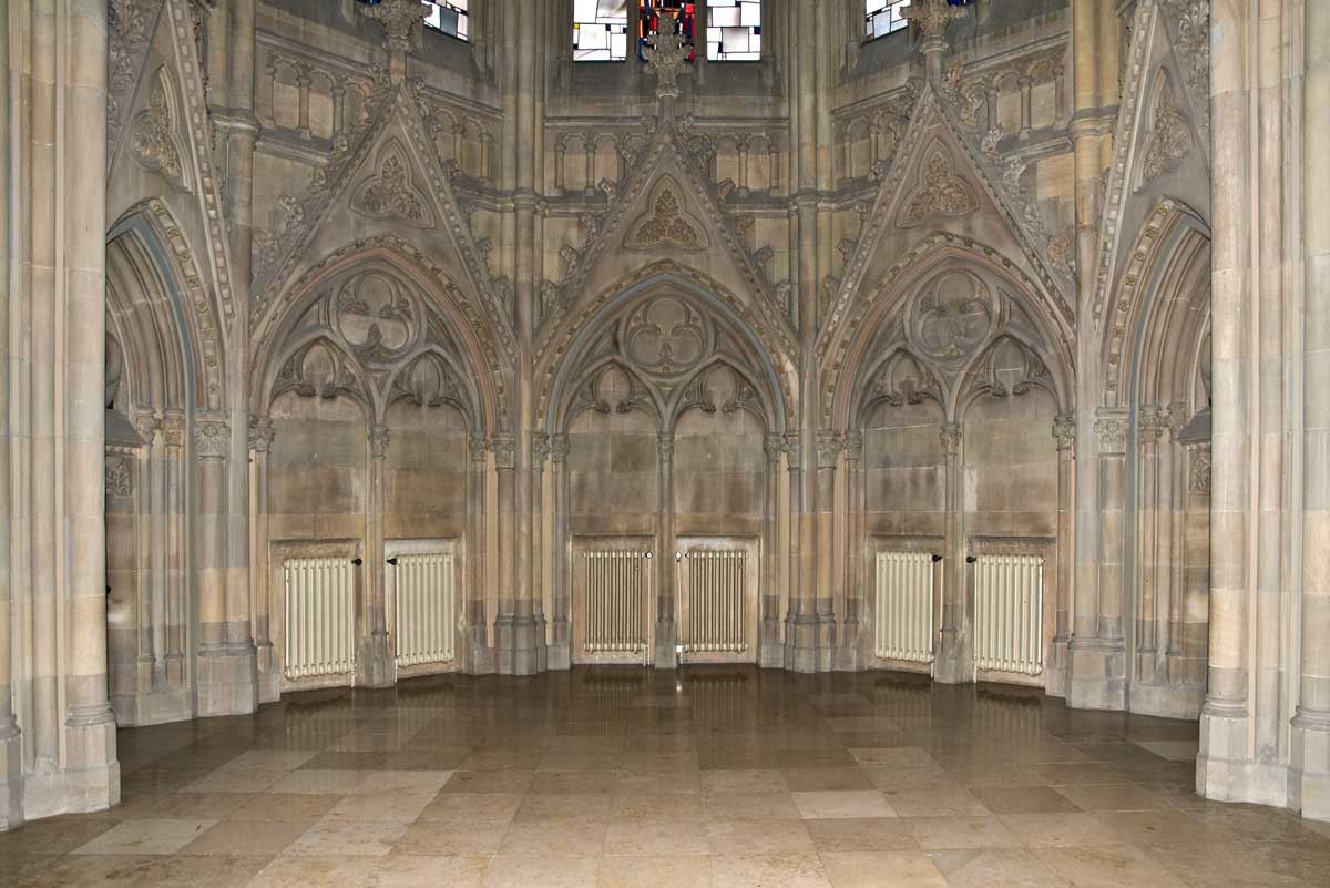 der fünfteilige Chor Aufgrund der städtebaulichen Gegebenheiten wurde die Kirche an der Straßenachse ausgerichtet.