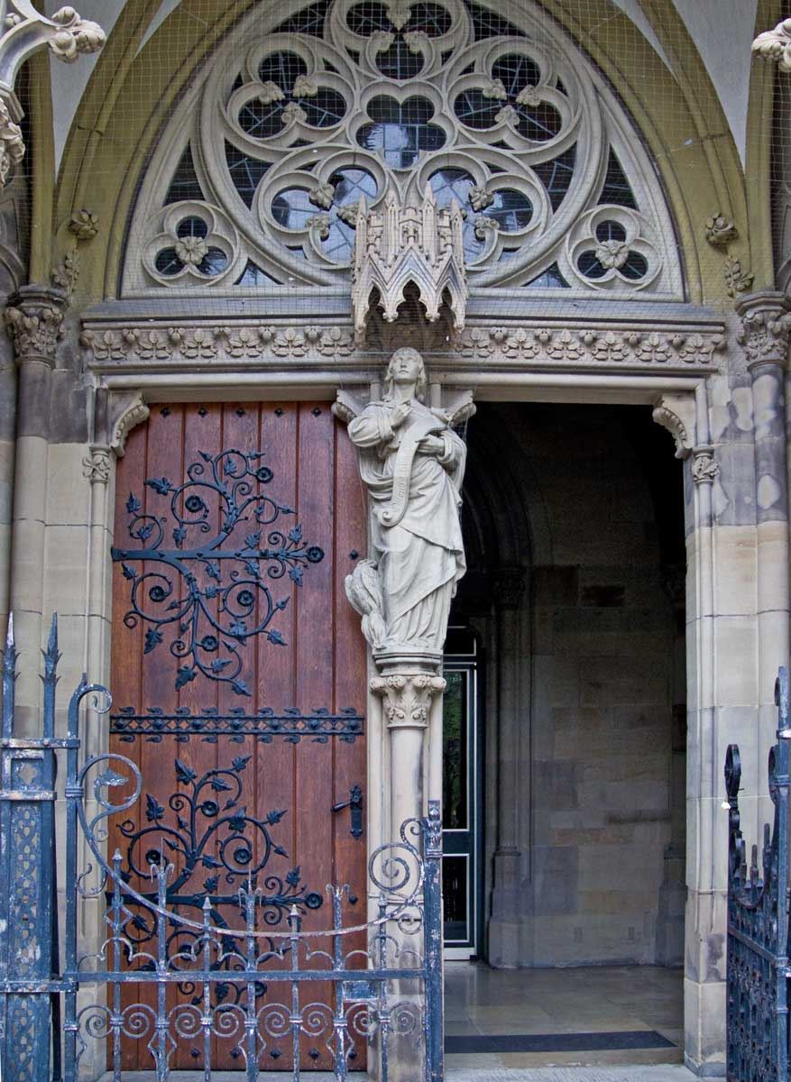 Rundgang um den Feuersee / die Kirche . Beginnend beim Hauptportal / Nordseite (Blick aus der Johannesstraße), dann entgegen des Uhrzeigersinns. Danach Details an Portal und Gemäuer.