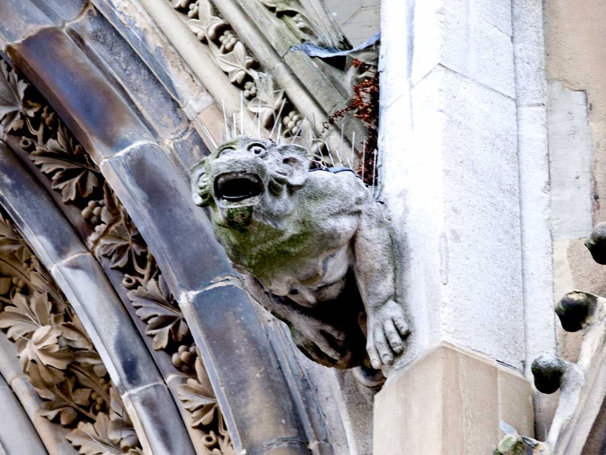 die hohen spitzbogig zulaufenden mit steinernem Maßwerk geschmückten Fenster und Portale,