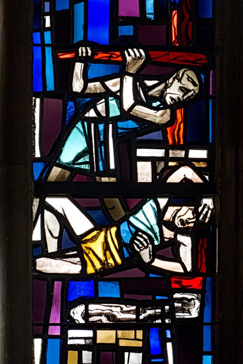 Das rechte Fenster steht für das Neue Testament. Unten ist die Steinigung des Stephanus dargestellt. Oben ist das himmlische Jerusalem zu sehen, Symbol für die vollendete Gemeinde.