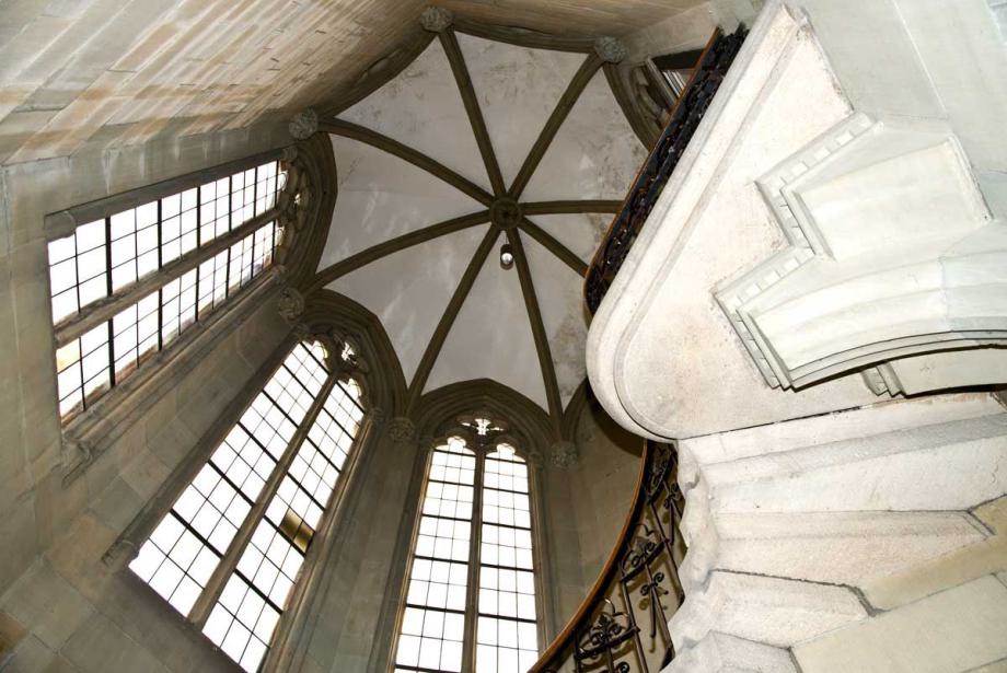 die hohen spitzbogig zulaufenden mit steinernem Maßwerk geschmückten Fenster und Portale,