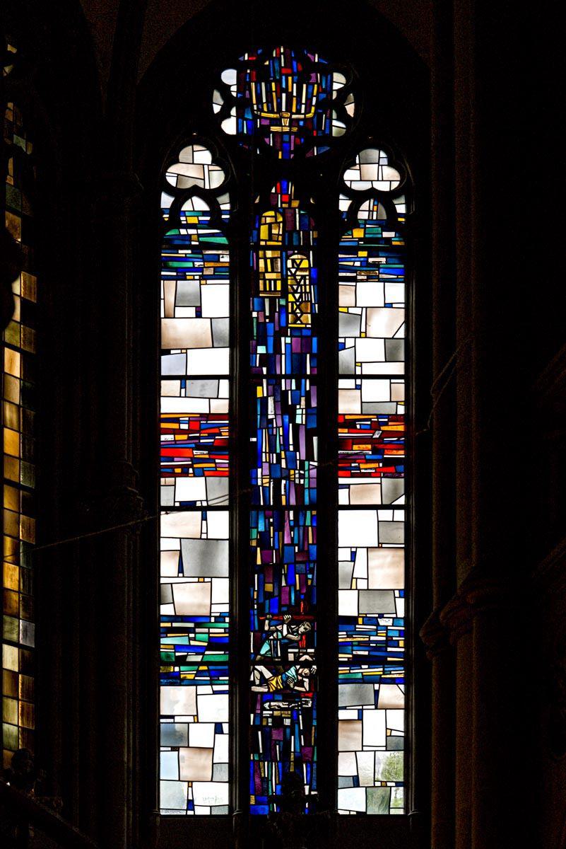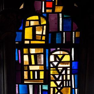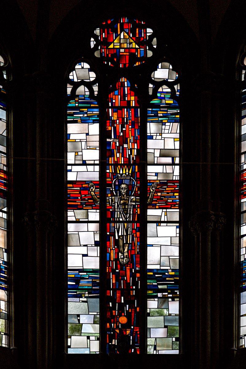 Die drei zusammenhängenden Fenster im Chorraum wurden 1969 von Professor Rudolf Yelin geschaffen.