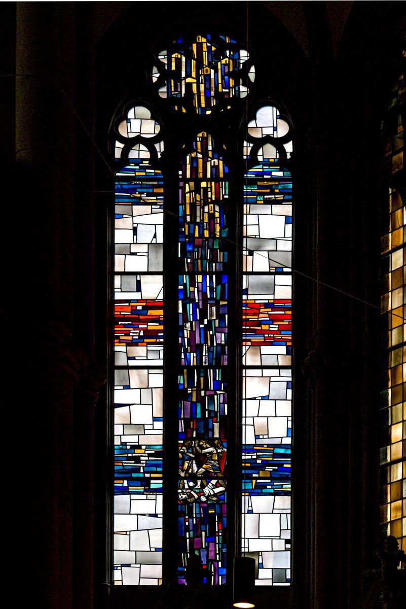 Das rechte Fenster steht für das Neue Testament. Unten ist die Steinigung des Stephanus dargestellt. Oben ist das himmlische Jerusalem zu sehen, Symbol für die vollendete Gemeinde.
