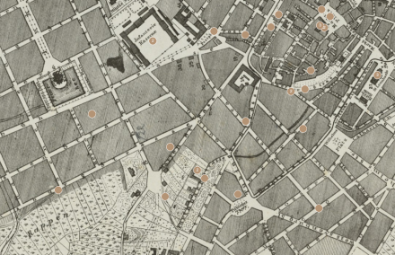 Wahrscheinlich ist kaum jemandem mehr bekannt, dass die Kirche ursprünglich an der Kreuzung Silberburg/Marienstraße gebaut werden sollte. Alternativ standen der Platz in der Verlängerung der Augustenstraße und am Feuersee zur Diskussion. Nicht überwindbare Schwierigkeiten beim Erwerb diverser Grundstücke (siehe Jahresberichte) führten schließlich 1863 zu einer Neuorientierung zum Platz am/im Feuersee. Die beiden Stadtpläne rechts (Quelle: Stadtarchiv der Landeshauptstadt Stuttgart) zeigen die Kreuzung Silberburg/Marienstraße und den Feuersee - 1871 bereits mit eingezeichneter Kirche.