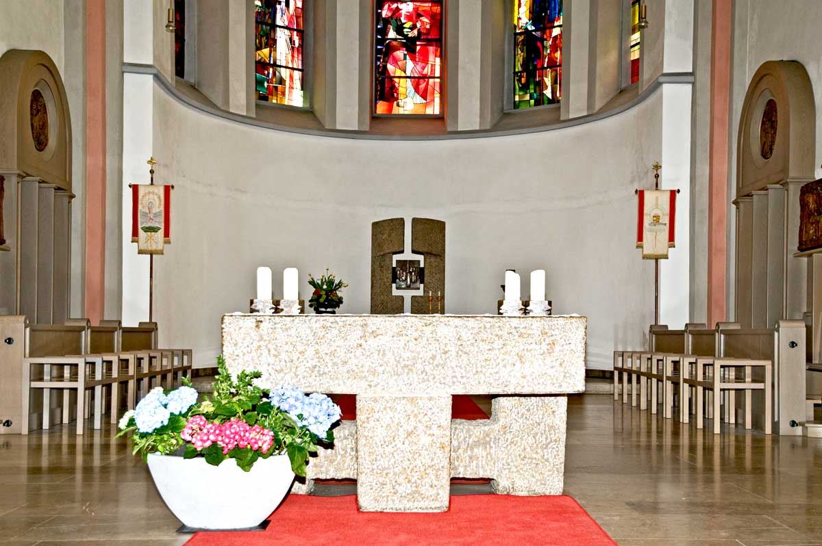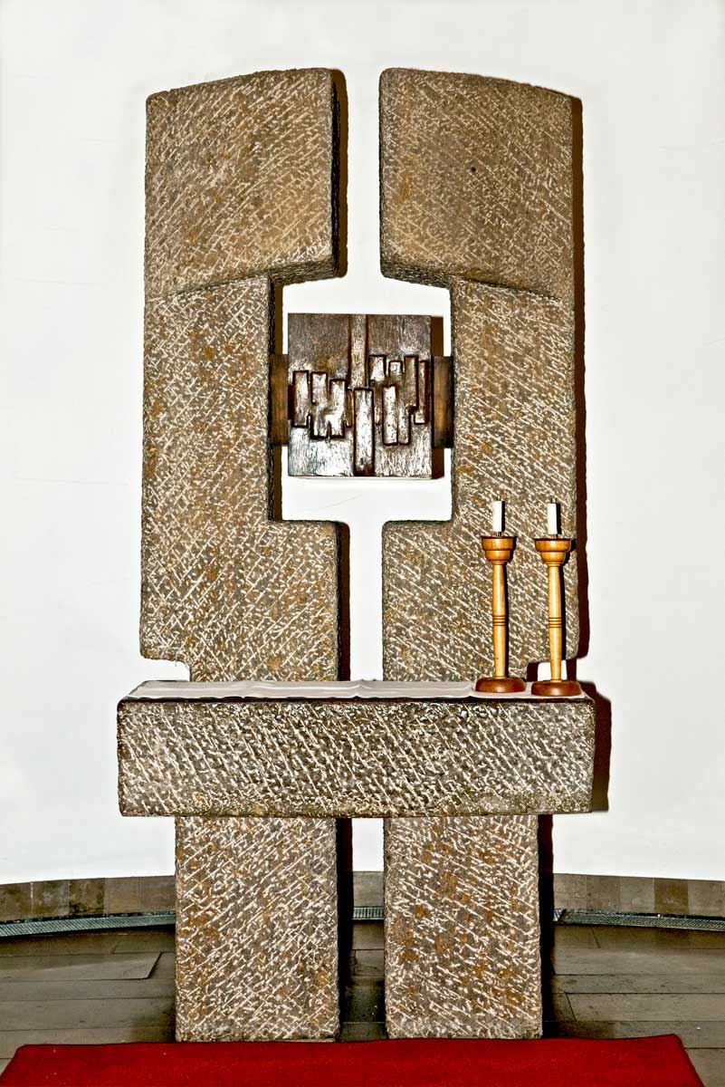 Altar, Ambo, Tabernakelstele, Priestersitz und Taufstein aus Muschelkalk wurden anläßlich der Renovation 1969 von Alfred Appenzeller geschaffen.