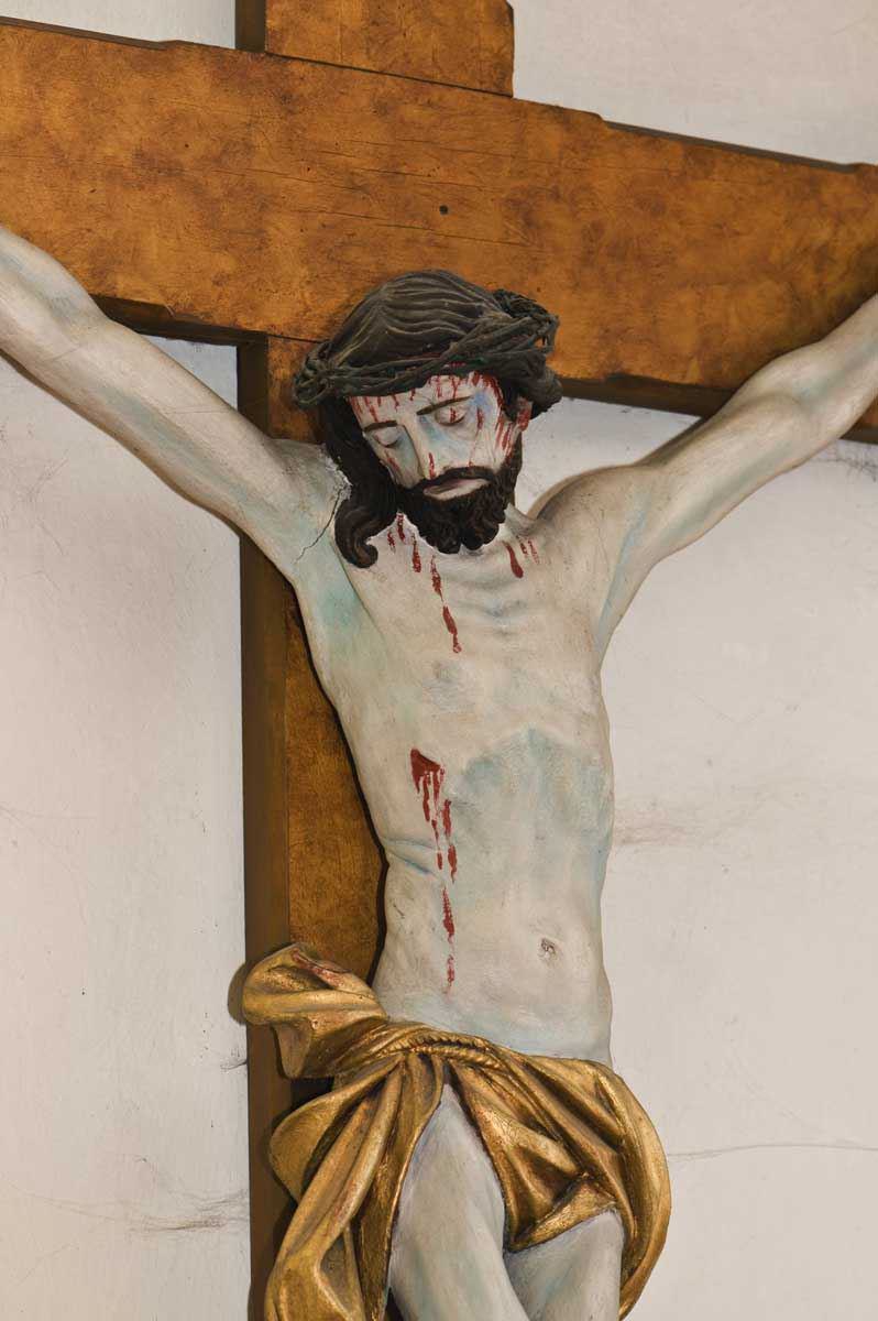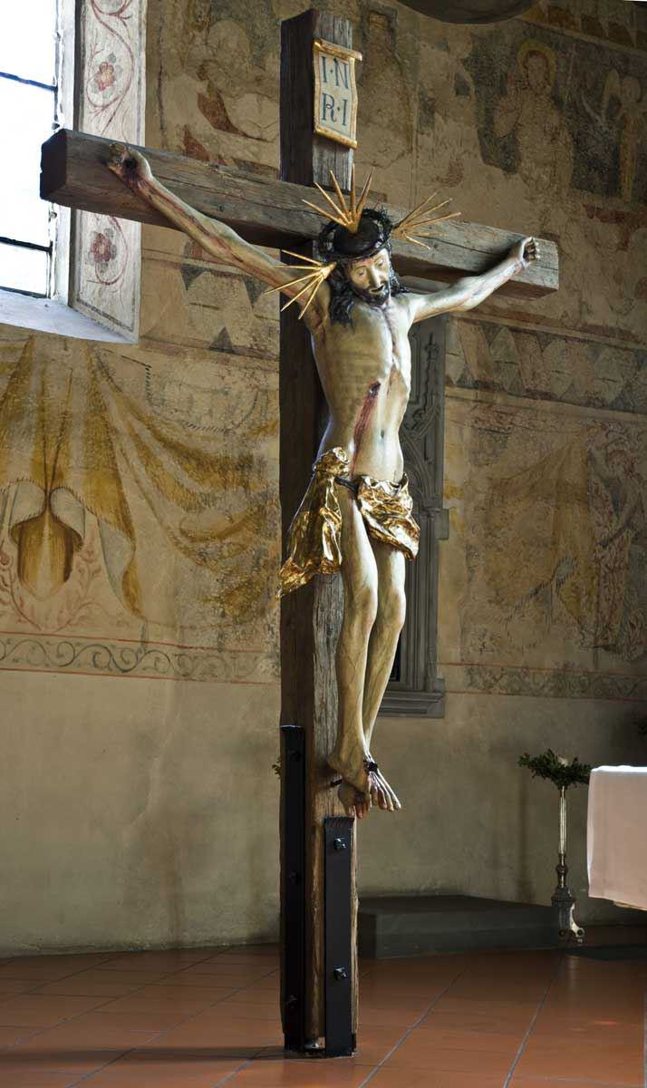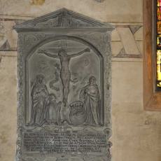 "Die gotische Kirche St. Georg wurde etwa 1390 gebaut und 1422 geweiht. Sie hat einen romanischem Turm und wuchtig wirkt, einen markanten Giebel, teils barocke Innenausstattung und umfangreiche Freskenmalereien und Skulpturen von Feuchtmeyer, Zürn und Morinck."