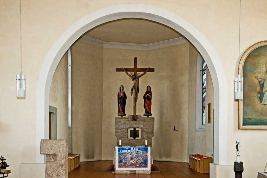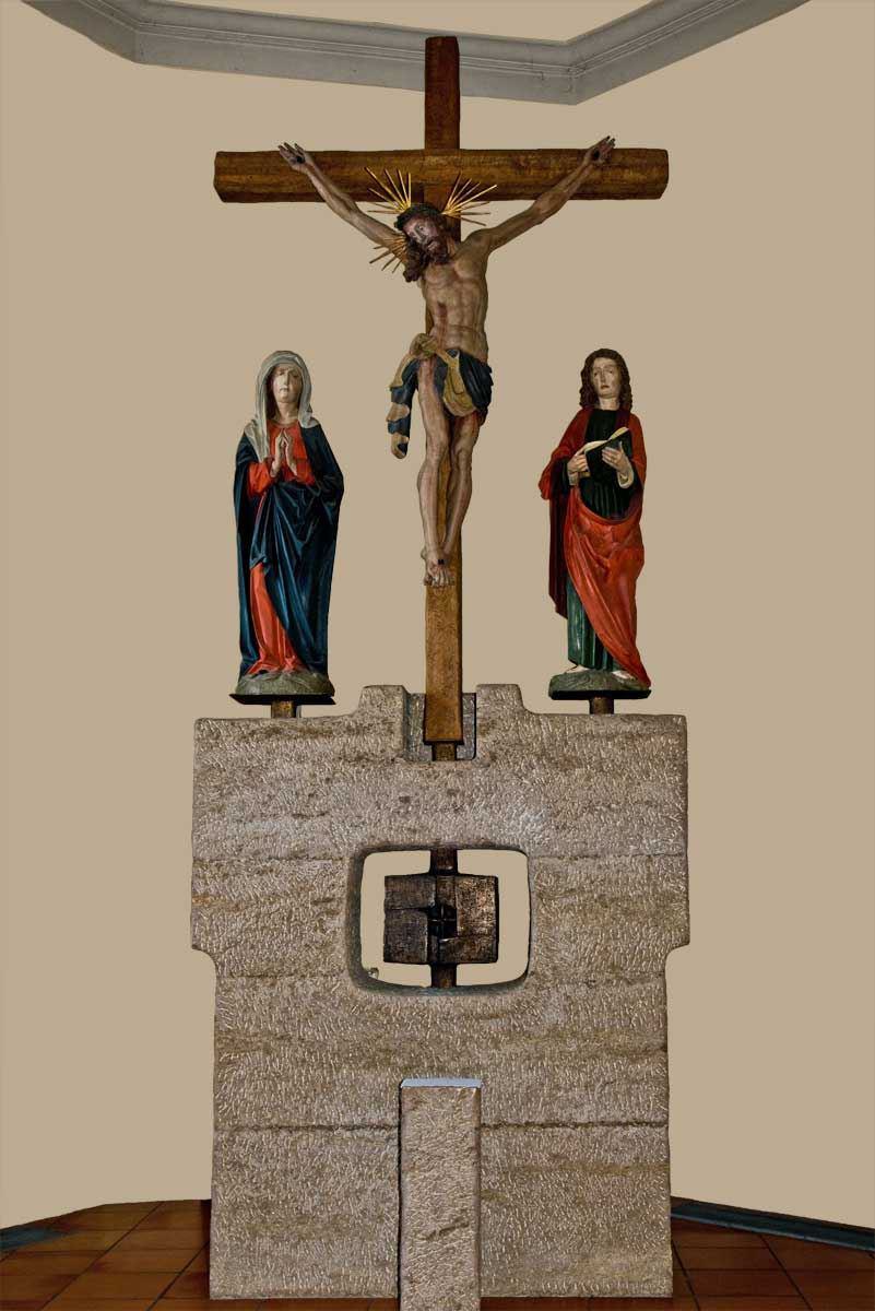 in dem der Tabernakel eingefügt und Basis für die Kreuzigungsgruppe (l. Maria, r. Evang. Johannes) ist