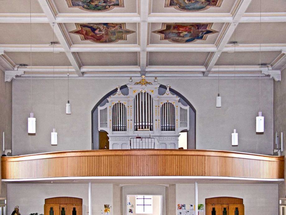 Die Deckengemälde im Chor und im Mittelschiff sind Werke des Kunstmalers Siebenrock aus Stuttgart. Sie wurden 1903 geschaffen, als man die Kirchenschiffmauern um 2 m erhöhte und die Kirche einen neuen Dachstuhl bekam. Auf dem großen Deckengemälde im Chor ist Jesus mit seinen Jüngern beim Letzten Abendmahl dargestellt. Das Mittelschiff ist in große Felder aufgeteilt. Der Zyklus beginnt über der Orgelempore und zeigt die Schutzpatrone der Kirchenmusik: König David mit Harfe und die hl. Cäcilia an der Orgel. Die weiteren sechs Bilder sind dem Andenken des Kirchenpatrons St. Gallus gewidmet. Sie zeigen Szenen aus der Lebensgeschichte des Heiligen.