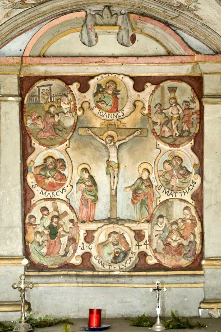 in der Mitte: die Darstellung der Kreuzigung Christi (mit Maria und Johannes).