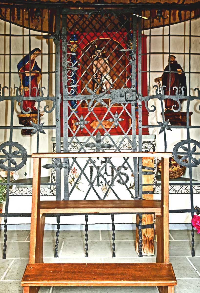 Das schöne schmiedeeiserne Gitter stammt aus der Zeit des Kapellenbaus. Im oberen, halbrunden Feld befinden sich die Arma Christi. Dies sind die Leidenswerkzeuge Christi, die oft wappenartig mit Nägeln, Leiter, Lanze und Rohr angeordnet sind. Unten am Gitter ist ein hölzerner Opferstock mit geschmiedeten Beschlägen befestigt."