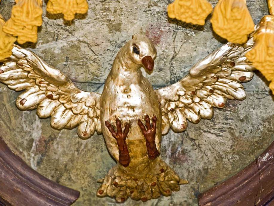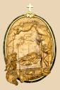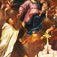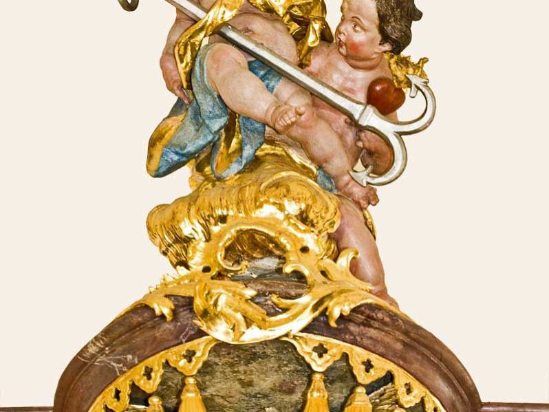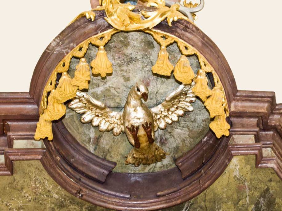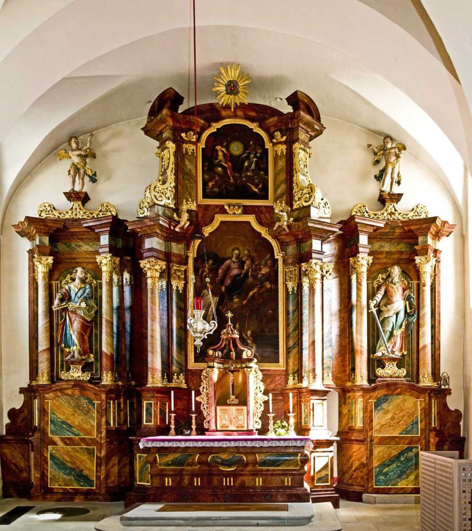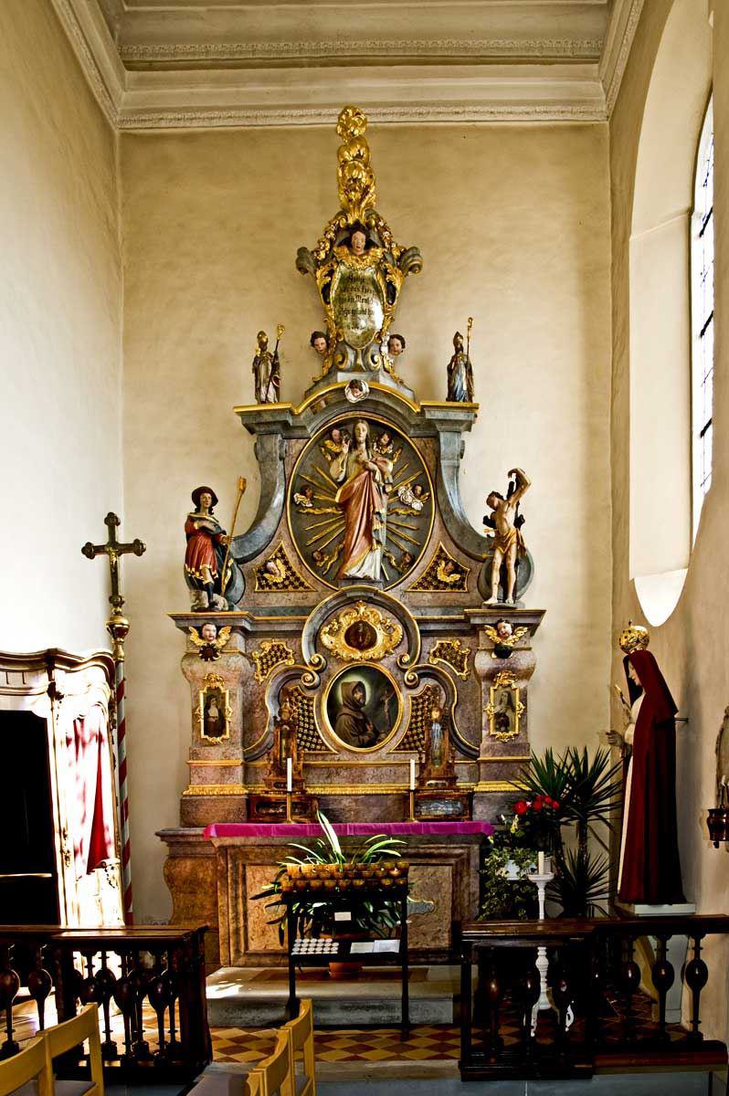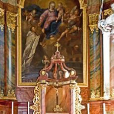 Das Altarbild zeigt die Vision des Karmeliten Simon Stock im Jahr 1251, wonach dieser von Maria das Skapulier überreicht bekommt, das seither nicht nur zum Habit der Karmeliten gehört, sondern auch zur Gründung der Skapulierbruderschaften führte, einer Laienvereinigung, die sich in besonderer Weise der Gottesmutter Maria verbunden fühlt. (Gerhard Wachter)